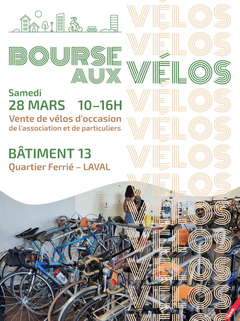 | La première bourse aux vélos de 2026 aura lieu le samedi 28 mars, au Bâtiment 13 (Quartier Ferrié – Laval). Vendeuses et vendeurs peuvent déposer leurs vélos sur place le vendredi 27 mars de 15h à 19h et le samedi 28 mars de 8h à 10h. La vente des vélos aura lieu de 10h à 16h le samedi 28 mars. Vendeuses, vendeurs, inscrivez-vous : bourse.placeauvelo.org Retrouvez toutes les informations sur la publication de l’évènement . |