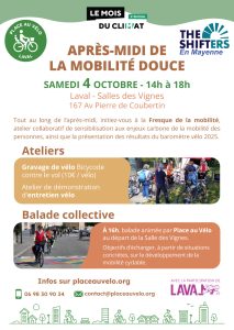 À l’occasion de la seconde édition du Mois du climat organisé par le Département de la Mayenne, l’association Place au Vélo organise une après-midi de la mobilité douce ainsi qu’une nouvelle bourse aux vélos. Ces évènements auront lieu le samedi 4 octobre 2025, à la Salle des Vignes (167 avenue Pierre de Coubertin, Laval). Au programme, …